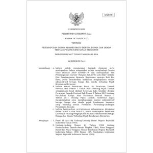 Peraturan Gubernur Bali Nomor 14 Tahun 2022 tentang Penghapusan Sanksi Administratif berupa Bunga dan Denda terhadap Pajak Kendaraan Bermotor. Klik...